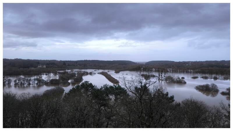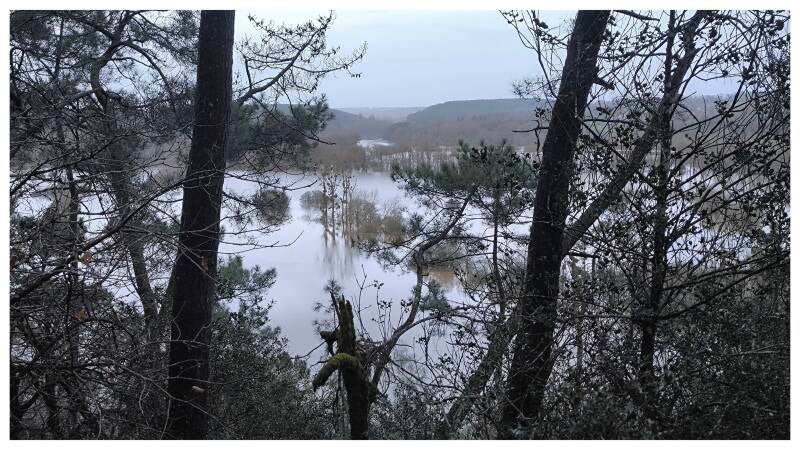 βͺοΈDu haut de La Beaulouise, les marais forment un océan jonché d'arbres, Ici et là, le tronc noyé. L'immensité des M3 d'eau s'amasse entre les deux monts "L'île aux Pies", le schiste surplombe, se dresse de marbre en maître des lieux.
